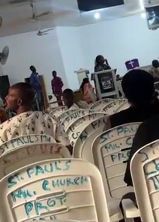 n interior view of a room, likely a church or meeting hall. Numerous white plastic chairs fill the space, many labeled with "ST. PAUL'S MIL. CHURCH PROT." in teal writing. Seated individuals, partially visible in the rows, listen to a woman speaking at a podium in the background. The room is brightly lit with fluorescent ceiling lights and ceiling fans. There are other people visible in the room.