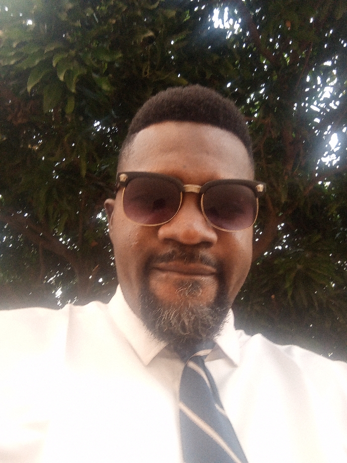 A man with short, dark hair and a graying beard wears sunglasses and a white shirt with a blue and white striped tie. He is facing the camera with a slight smile. The background features green foliage and dappled sunlight, suggesting an outdoor setting. The focus is primarily on the man's face, with the foliage slightly blurred in the background.