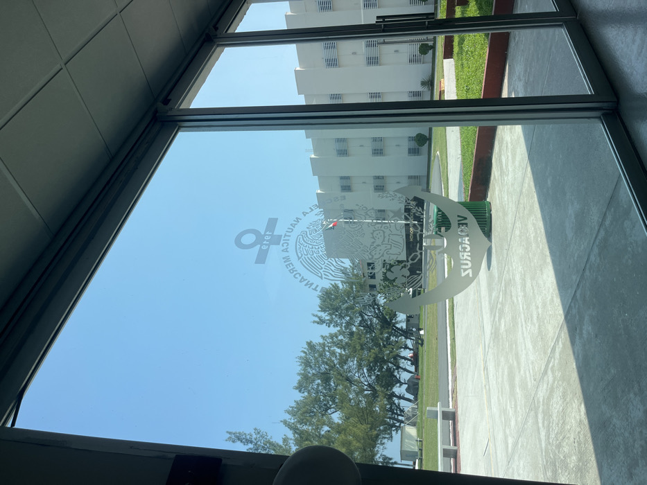 The image displays an exterior view through a large, multi-pane glass window from inside a building at the Escuela Náutica Mercantil (Merchant Marine School) in Veracruz City, Mexico