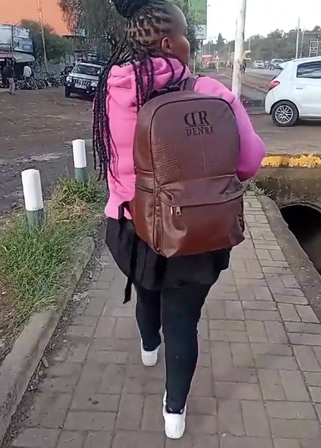 A woman with braided hair styled in a bun walks on a paved sidewalk, away from the camera. She wears a pink hooded sweatshirt, black pants, and white sneakers, and carries a brown backpack with the letters "DR DENRI" printed on it. The sidewalk is bordered by low white bollards and grass on one side, and a street with parked cars, buildings, and a billboard on the other. The sky is overcast.