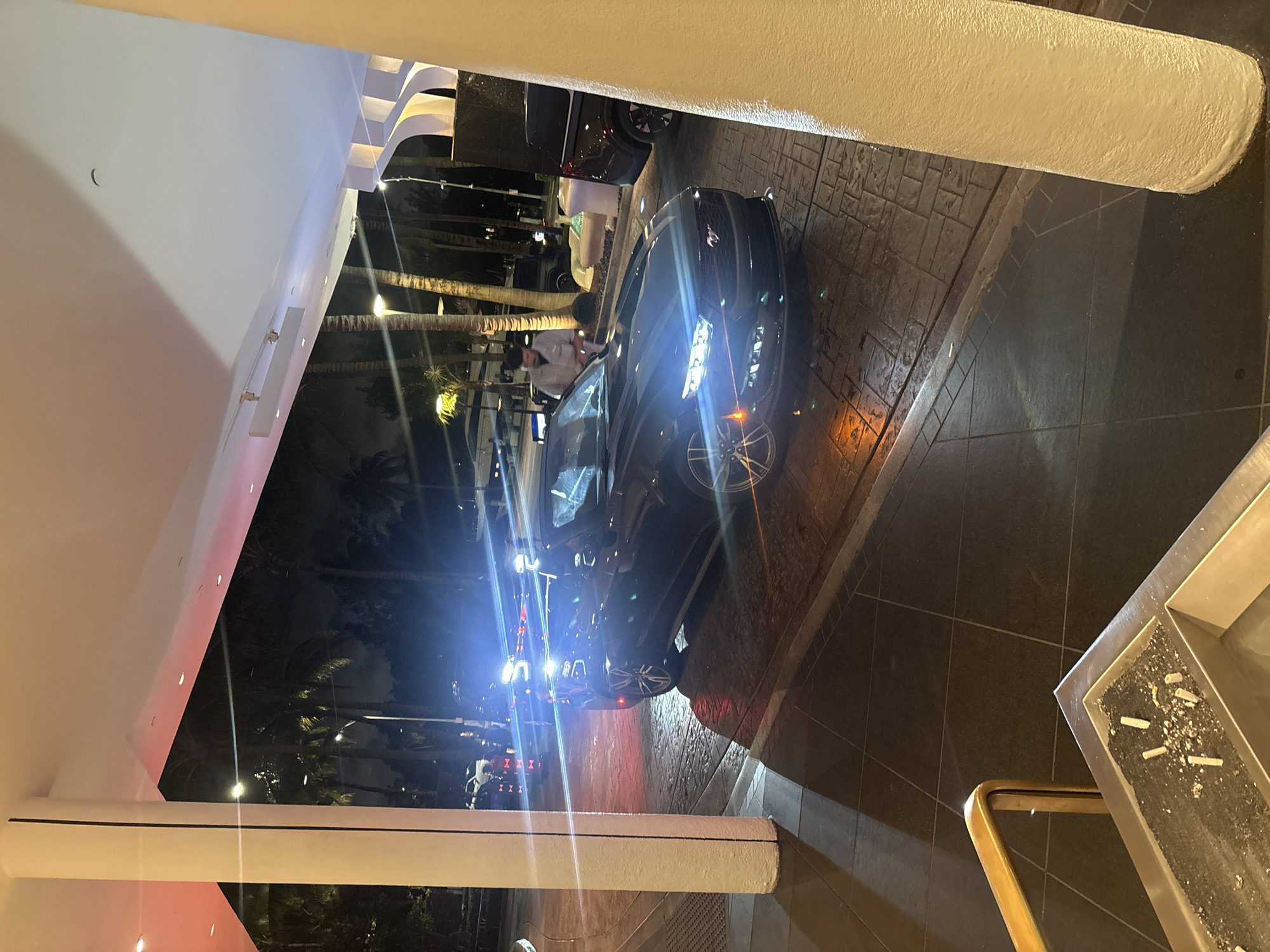 dark-colored car parked in front of a building entrance at night in Miami Beach, United States of America. A person stands by the driver's side of the car. Palm trees are visible behind the parked vehicles. An ashtray stands in the foreground. The building has white pillars. The environment is urban with street lighting.