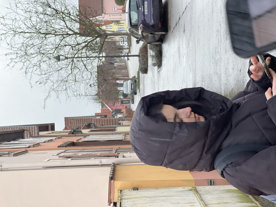 An outdoor scene in the city of Meistratzheim, France, depicts a young female in the foreground on a wet, overcast day. The subject, viewed in profile from the right, occupies the left half of the frame. She wears a black, hooded puffer jacket with the hood fully up, obscuring most of her dark hair. Her visible right hand holds and interacts with a smartphone; her left hand is also engaged with the device. A dark backpack strap is visible over her left shoulder. To the subject's immediate left, a light yellow-orange building wall with white trim and a white wooden gate is visible. The background reveals a residential street, characterized by wet asphalt, indicating rain or recent precipitation. A dark purple Renault Zoé (license plate GD-040-GG) is parked on the right side of the street, facing away from the viewer. Further down the street, a silver hatchback is parked on the left, facing towards the viewer, with additional vehicles visible in the distance. The street is lined with multi-story buildings featuring pitched roofs and varied pastel facades, including light peach, orange-brown, yellow, and pink, consistent with traditional Alsatian architecture. These buildings have windows, some with closed shutters. A prominent leafless deciduous tree stands on the right side of the street, adjacent to a dark, ornate lamppost. Several small, low-lying shrubs are planted in circular beds along the roadside. The sky is uniformly grey and overcast.