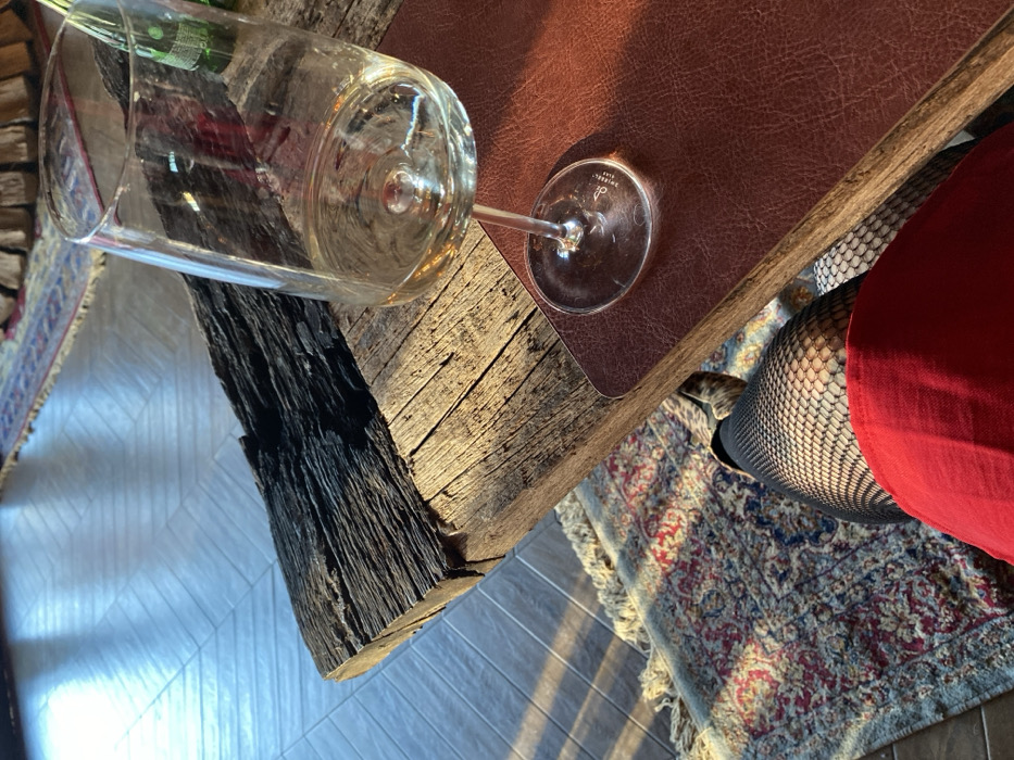 The scene depicts an interior view in Ulcinj - Ulqin, Montenegro, from a high-angle perspective looking downwards. The lower portion of a person's body is visible in the bottom-left quadrant, wearing black fishnet stockings, a red garment (likely a skirt or dress), and leopard-print shoes. A distressed, dark wooden table or surface occupies the central and right areas of the frame. On this surface, a rectangular dark brown leather-like placemat is positioned, upon which a clear wine glass containing a small amount of light-colored liquid (presumably white wine) rests. The base of the glass is etched with "Riedel / Spiegelau" and "Made in Germany". Partially visible in the upper-right corner, behind the wine glass, is a green glass bottle with a light-colored label. The floor consists of two visible sections: a light-colored tiled area with a herringbone pattern in the upper-left background, illuminated by strong natural light casting distinct parallel shadows; and a section of an ornate, patterned rug with fringes, featuring red, blue, and cream tones, in the lower-left background, beneath the person's legs and the wooden surface.