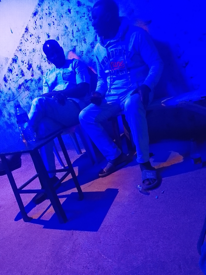 Two men sit illuminated by blue light. One wears a traditional shirt and cap, seated on a chair at a small table with a water bottle. The other wears a hoodie and pants, seated on a higher surface, possibly a ledge. Both appear relaxed. Their faces are shadowed, making identification difficult. One wears sandals. The setting seems indoors, possibly a casual gathering spot. Shadows stretch across the floor.