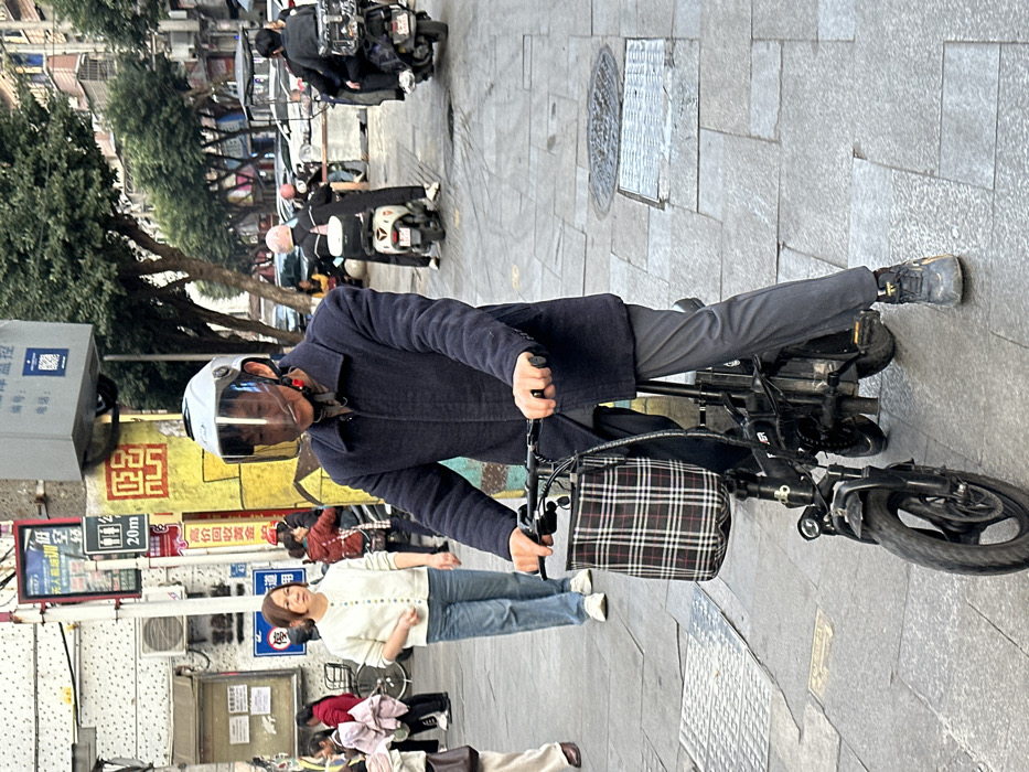 This image captures an urban street scene in Jiangjin, China. In the foreground, an adult male, approximately middle-aged, is positioned on a black folding electric bicycle. He wears a light-colored helmet with a clear visor, a dark blue collared coat, dark grey trousers, and dark sneakers with yellow accents. His hands grasp the handlebars, and a black, red, and white plaid basket is attached to the front of his bicycle. His left foot is near the ground. To the left and slightly behind him, an adult female with shoulder-length brown hair stands facing forward, wearing a white button-up cardigan and blue jeans. Other pedestrians are visible further back on the sidewalk. In the mid-ground and background, multiple individuals are riding motor scooters or electric bikes on the street. One rider, wearing a dark jacket and light helmet, is seen from the rear. Another scooter carries a passenger and has a cargo box attached to the rear. Parked and moving vehicles are visible further down the street. The environment features a tiled sidewalk with multiple drain covers. A prominent yellow and red painted concrete pole with Chinese characters stands to the right of the central male. A grey rectangular box, featuring Chinese text and a QR code, is mounted on this pole. Buildings with various signs displaying Chinese characters and air conditioning units line the street, and trees are interspersed along the thoroughfare. The scene suggests a busy daytime street in a commercial or residential area.