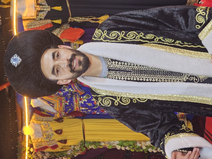 A person wearing a traditional black and gold robe with white fur trim, along with a large black turban adorned with a jeweled emblem, is captured in this image. The individual, who has dark hair and a beard, is positioned against a backdrop that includes colorful textiles and garments displayed on mannequins. The garments are adorned with embellishments and gold detailing.