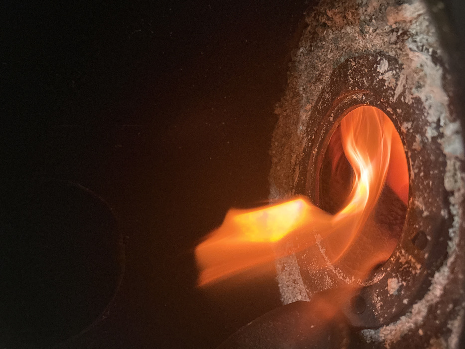 An intense orange flame emerges from within a dark, circular opening. The outer edges of the opening are rough and coated with a gray, ashy substance. The flame extends outward, blurring with rapid movement, against a backdrop of darkness. The interplay of light and shadow accentuates the heat and energy emanating from the fire.