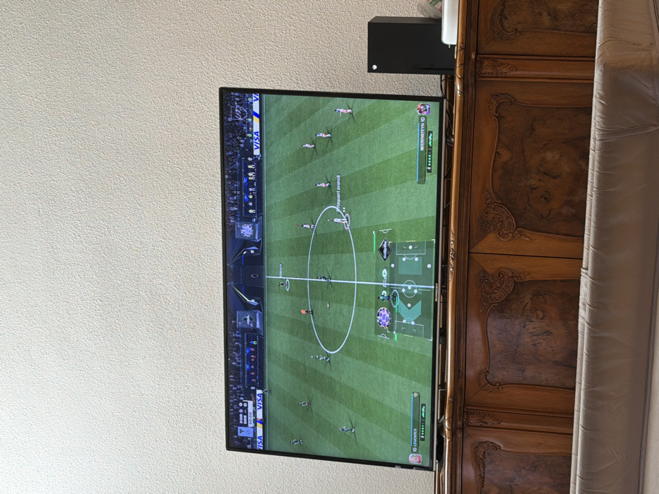 This image, captured in Eschau, France, depicts an indoor domestic scene. A large flat-screen television occupies the center, displaying a soccer video game in progress. The game scoreboard indicates "KOR 0 - 0 GRE" at "00:00". Virtual players, identifiable by green and white/red kits, are positioned on a striped green digital pitch. On-screen overlays show player names such as "10 LEUCHTER" and "BEERENSTEYN 10", alongside a tactical map in the lower center. To the right of the television, a black Xbox Series X console stands upright, adjacent to a smaller white electronic device. The television rests on a dark brown wooden credenza, which features multiple ornate carved panels across its front. The background consists of a light-colored, textured wall. The upper portion of a light brown, tufted sofa is visible in the immediate foreground.