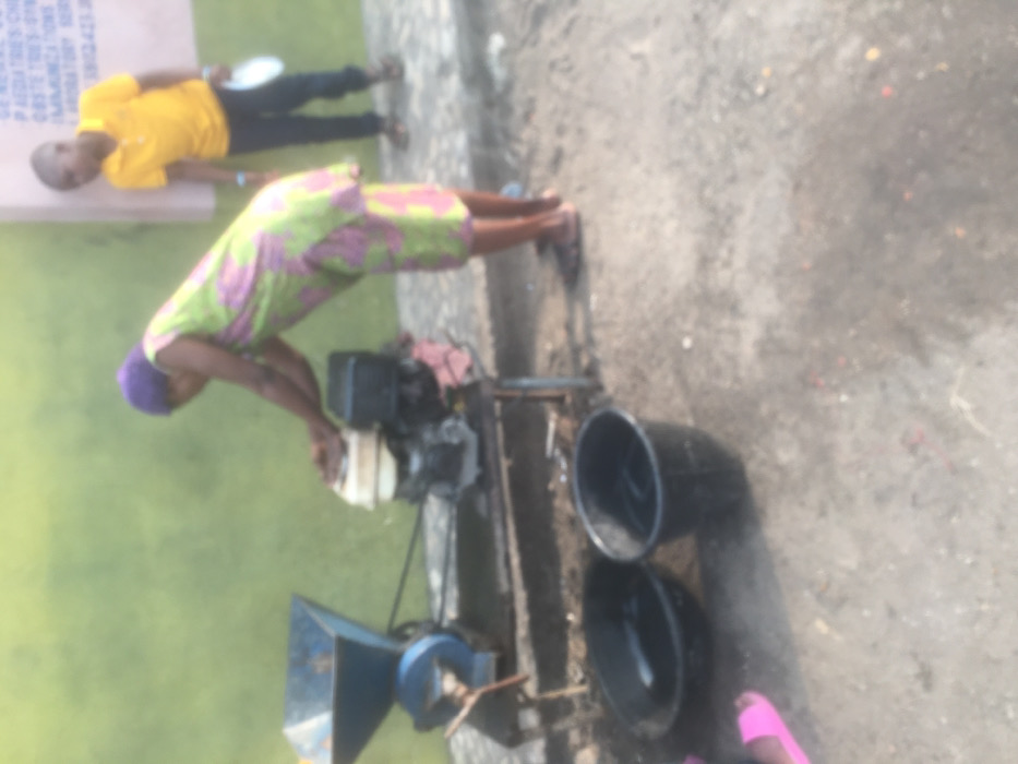 A woman wearing a lavender headwrap and a green and purple patterned dress bends over a blue and silver machine, which appears to be a mill, with two black buckets beside it. In the background, a person in a yellow shirt and dark pants stands on a concrete surface. Another person wearing pink sandals is visible near the bottom. The scene seems to be outdoors, with greenery and a building visible in the backdrop.