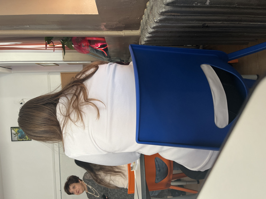 The image depicts an interior scene, likely a classroom or conference room, located in Panagyurishte, Bulgaria. In the immediate foreground, the back of a blue plastic chair is visible, occupied by a person with long brown hair, wearing a white long-sleeved garment, facing away from the camera. A white table edge is partially visible in the bottom left. To the left of the central figure, an older woman with short dark hair, adorned with multiple pearl necklaces and a patterned top, is visible from the chest up, smiling and seemingly addressing others to her right. Behind her, another person with long brown hair is seated at a table with an orange plastic chair. The background features a white wall with a framed picture in the upper left and a small white security camera mounted below it. A white rectangular board or screen is behind the older woman. To the right, a dark vertical partition or door frame separates the main room from an area containing a red curtain or fabric and a potted plant with red flowers and a red decorative ribbon. A large, grey, cast-iron radiator with the faint marking "28" is visible along the far right edge of the frame. The room is brightly lit.