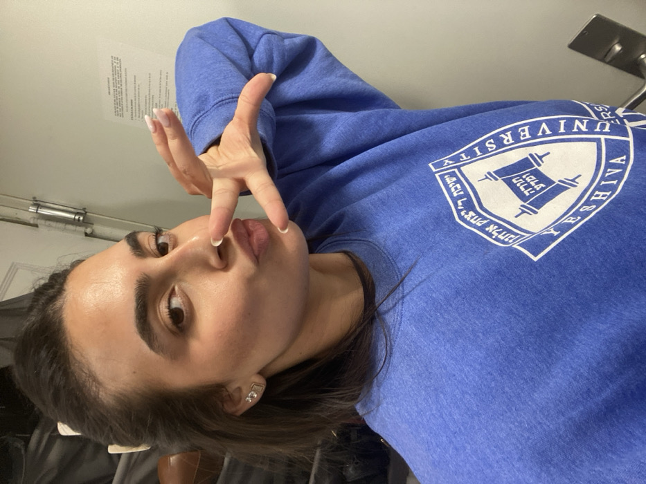 A woman in a blue Yeshiva University sweatshirt poses for a selfie