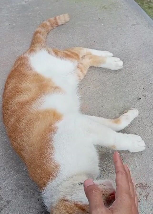 A person's hand pets the head of an orange and white cat laying on its back on a concrete surface. The cat is mostly white on its underside and orange on its back, head, and tail. The cat has its eyes closed. Some green vegetation and a wooden support beam are visible in the background.