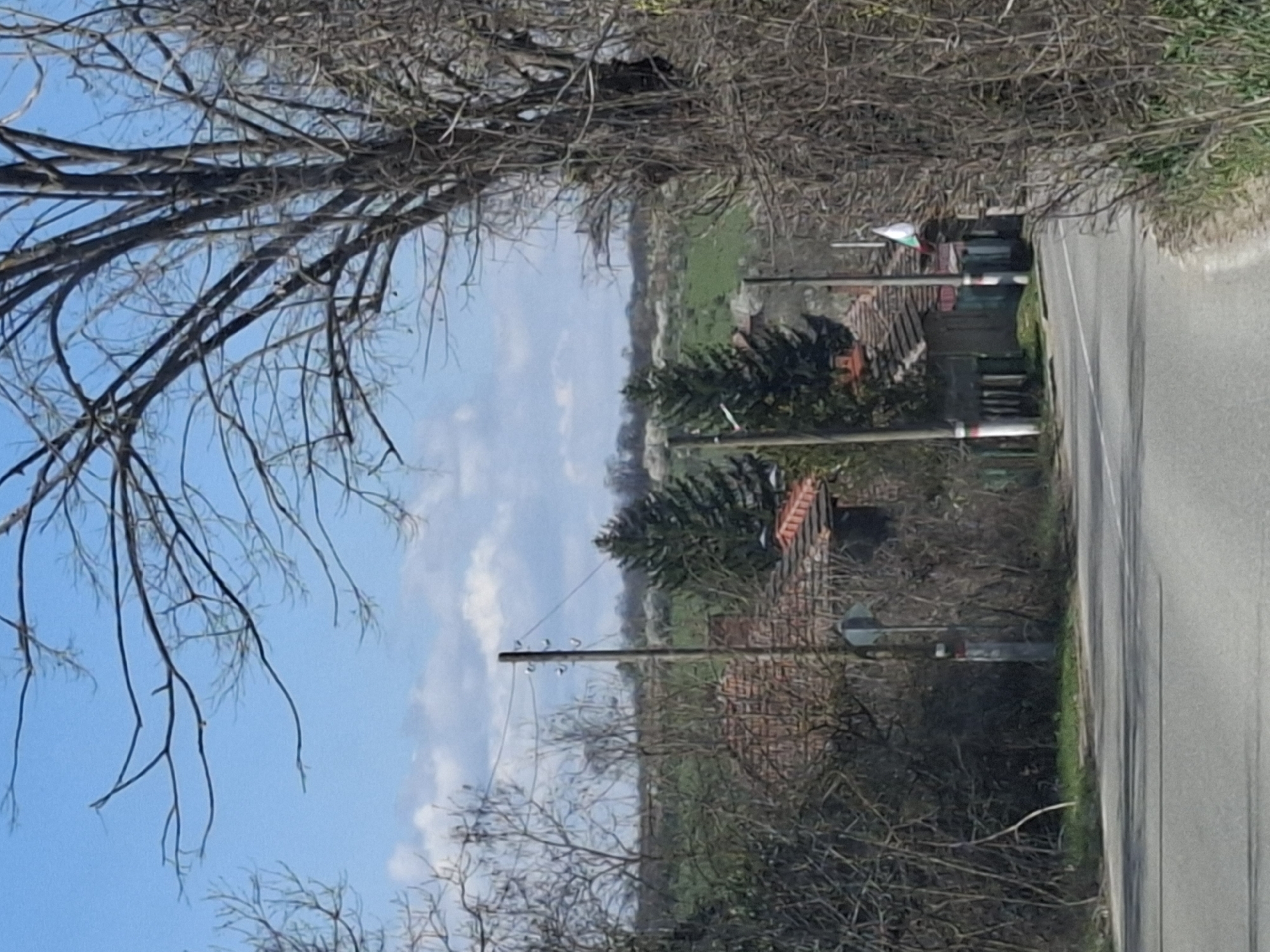 A roadside scene in Smirnenski, Bulgaria shows a grey asphalt road running vertically on the right side of the image. A thin strip of green grass separates the road from a view of homes and fields. A row of bare trees lines the left side of the frame, obscuring the blue, partially cloudy sky. In the distance, houses with red-tiled roofs are visible, interspersed with evergreen trees and grassy fields. Utility poles stand near the houses, extending from the bottom to near the center of the image. A sign post is also visible beside the houses and road.