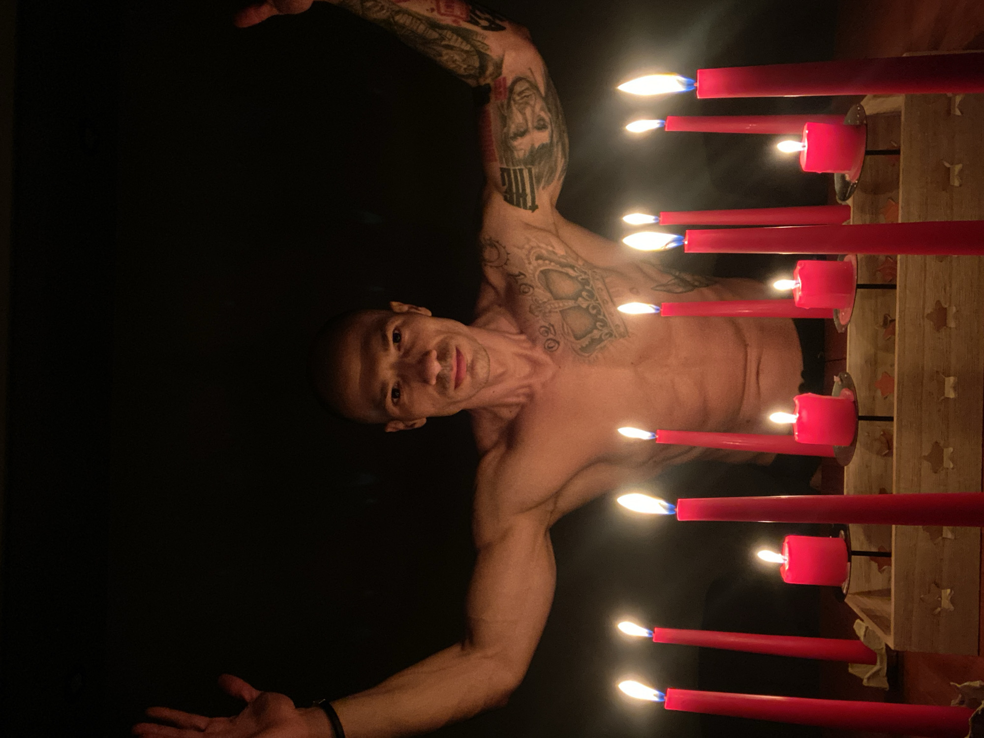 The scene depicts a male individual within a dimly lit indoor environment in Pleven, Bulgaria. The man, appearing in the upper middle frame, is shirtless with a shaved head or very short hair, and faces the camera directly with a neutral expression. His arms are raised and outstretched to his sides, palms forward, revealing extensive tattoo work. A large crown tattoo, with the numbers "02" nearby, is visible on his upper right chest/shoulder area. His left arm features a full sleeve tattoo, including a prominent portrait on the bicep. A dark bracelet is present on his left wrist. In the foreground and mid-ground, twelve red candles are displayed, all actively burning and providing the sole illumination. Eight of these are tall, slender taper candles, some of which are held in place by small bases or melting into them. Four are shorter, thicker pillar candles, each placed on an individual metal holder with a black stem. These pillar candles, along with some taper candles, are arranged within a light-colored wooden rectangular tray adorned with star-shaped cutouts along its visible side. The background is completely dark.