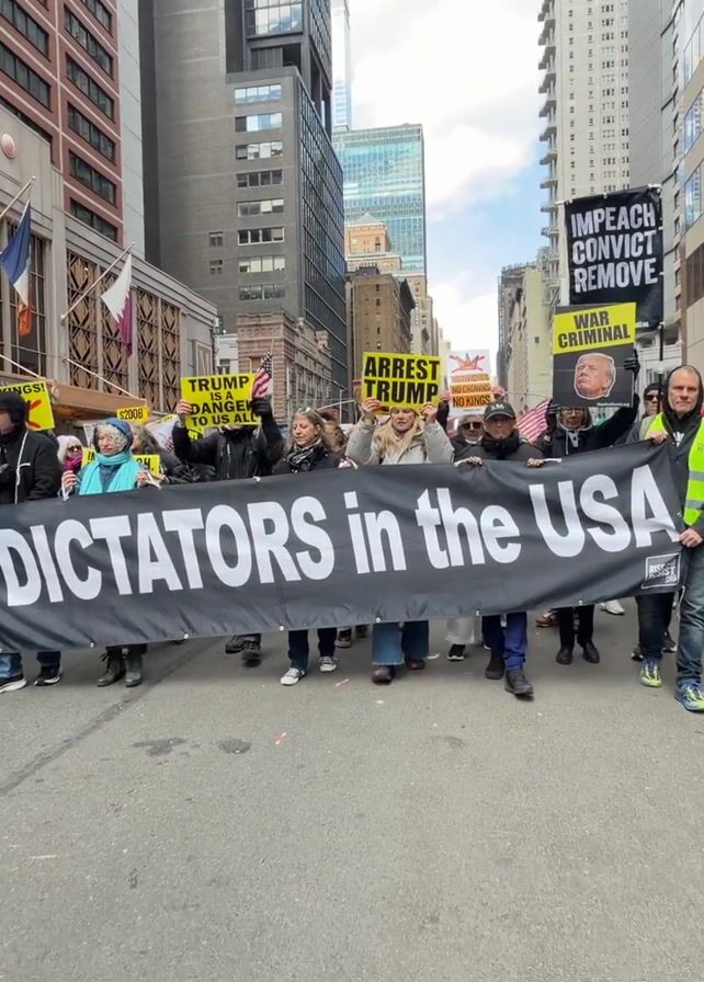 A crowd of protestors marches down a city street flanked by tall buildings. The group is holding signs and a large banner that reads "NO DICTATORS in the USA" in bold, capital letters. Some protestors wear yellow vests. Some protestors hold up flags and additional signs. The street is paved and appears to be closed to traffic. The overall tone suggests a demonstration or protest against perceived authoritarian tendencies within the United States.