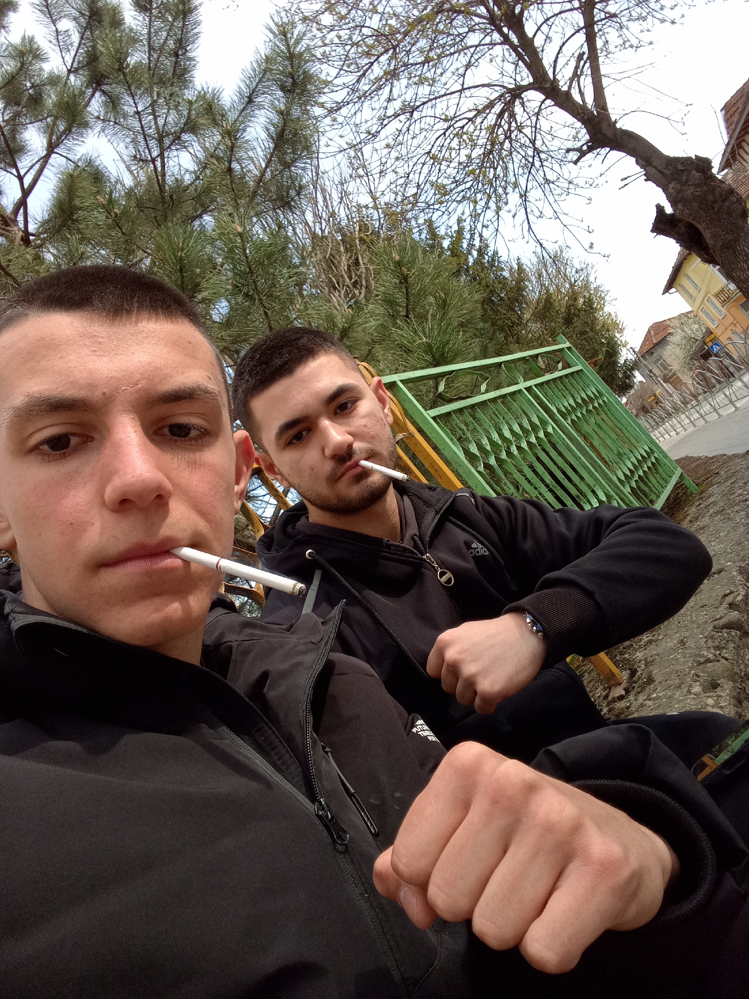 Two young men are posing for a selfie outdoors. Both are holding cigarettes in their mouths. They are wearing dark-colored jackets. The location appears to be a park or recreational area. Behind them is a green metal fence. In the background, there are trees and a building, suggesting an urban setting. The specific location is Zlataritsa, Bulgaria.
