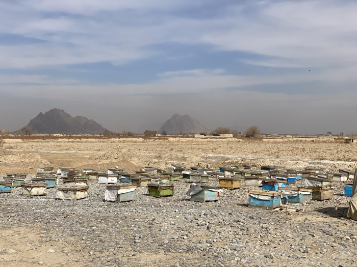 This image, captured in Nakhonay, Afghanistan, displays an arid, rural landscape dominated by an apiary