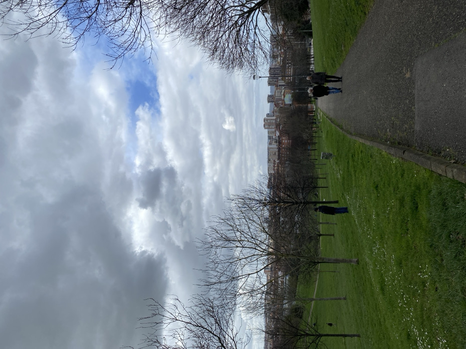 The image displays an outdoor park scene located in Gijón, Spain, providing an elevated view of the city under a sky with mixed grey clouds and clear blue patches. In the foreground and mid-ground, a wide, gently sloping expanse of green grass is visible, dotted with small white flowers. Numerous deciduous trees with bare branches are scattered across the grassy areas, indicating a winter or early spring season. A dark grey asphalt path, bordered by a raised concrete curb on its left edge, extends from the lower right corner towards the center of the mid-ground. Three individuals are present. Two adults are walking abreast on the asphalt path, moving away from the viewer. The person on the left wears a dark jacket, and the person on the right wears a grey jacket and dark trousers. A third individual stands alone on the grassy slope to the left of the path, facing away from the camera, dressed in a dark long-sleeved top and blue jeans. In the far left background, a small, indistinct dark figure is barely visible on the grass. Objects include a grey cylindrical waste bin situated on the grass to the left of the path, and a black lamppost positioned to the right of the path in the mid-ground. The background features a dense urban landscape of Gijón, consisting of numerous multi-story apartment buildings and structures, predominantly in shades of brown, grey, and white, stretching towards the horizon.