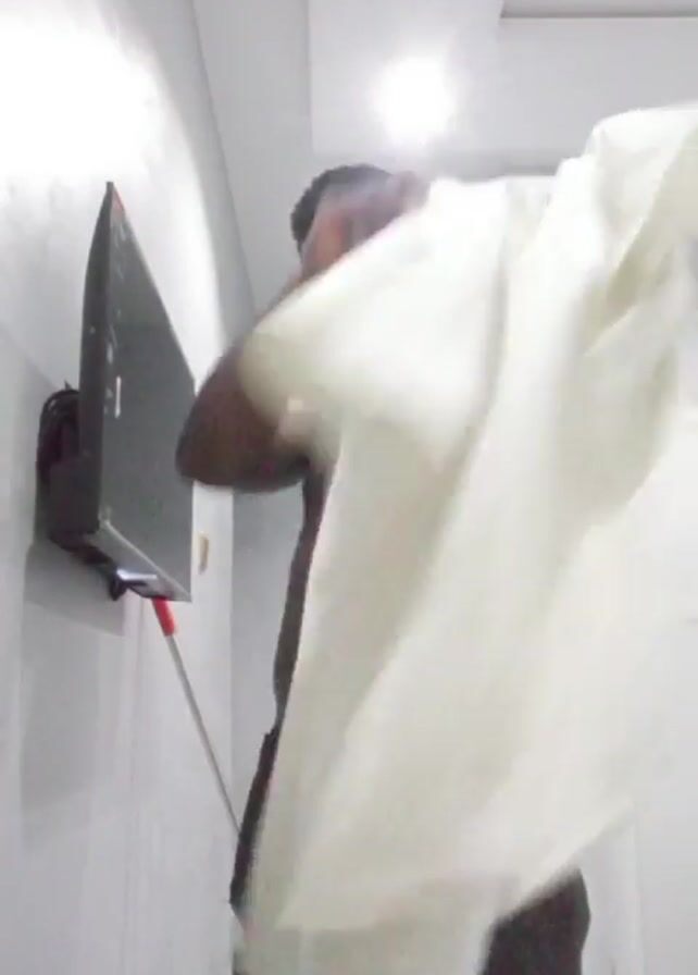 A man, shirtless and wearing dark pants, is putting on a white, short-sleeved button-down shirt in a room. He lifts the shirt over his head, pulls it down, and adjusts it. A television is mounted on the wall behind him and to his left. A mop stands in the corner. The walls are light-colored. The room is brightly lit from above.