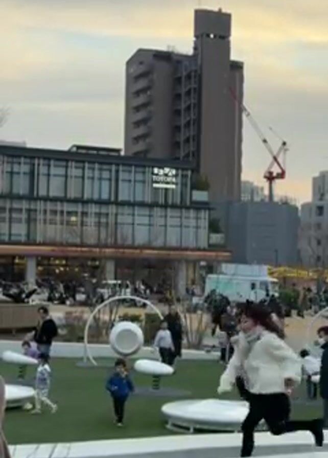 public park in an urban setting. There is a building with the word "TOTOPA" visible on its facade. A tall, modern building is located behind the park, and a construction crane stands next to it. People are walking and children are playing in the park. The playground features modern, white play structures. The sky is overcast with an evening light.