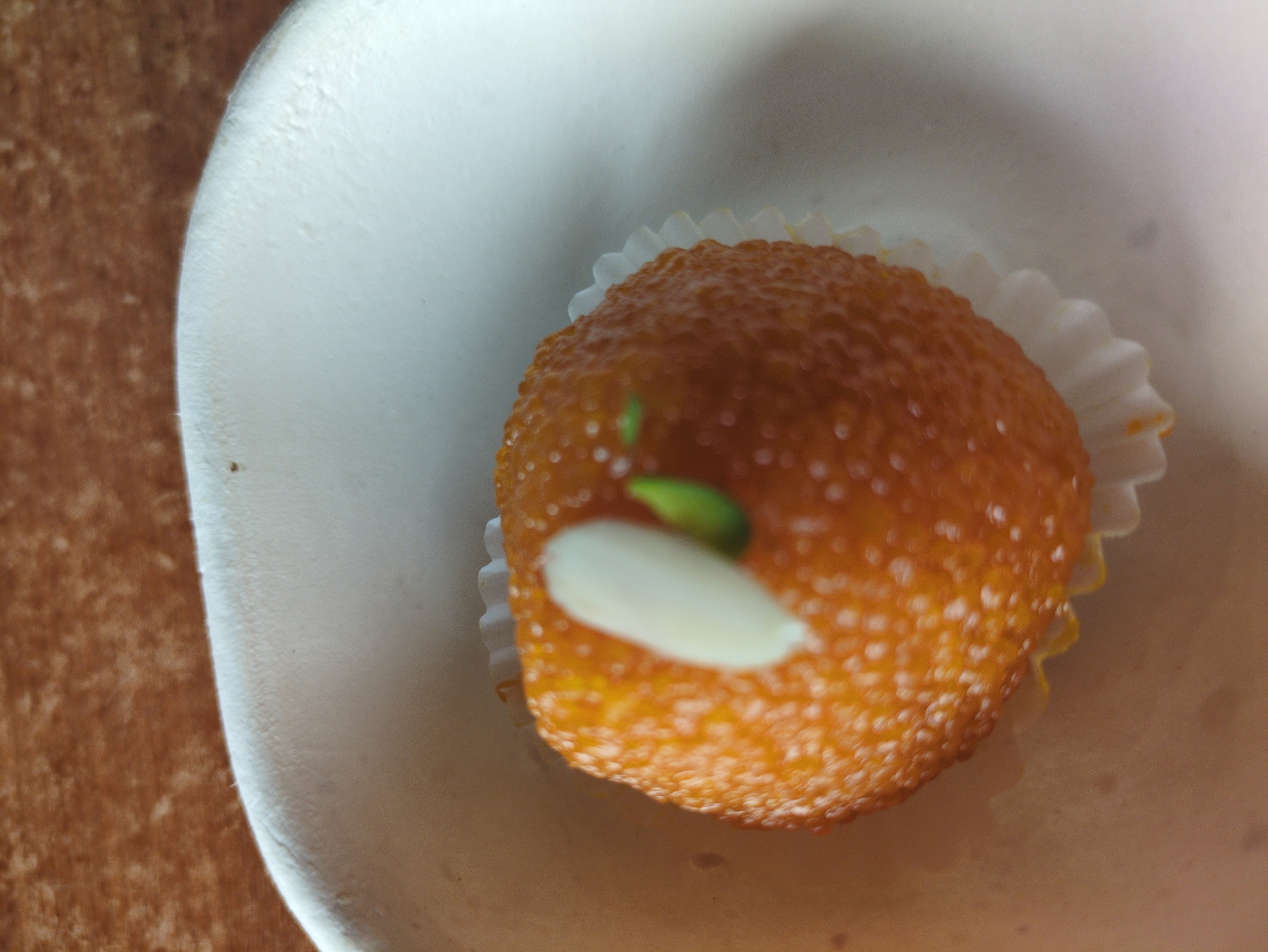 - "A sweet, possibly Motichoor Laddu, sits in a small, white paper cup placed within a white ceramic bowl" by FM-8aYxT2, licensed under CC BY 4.0