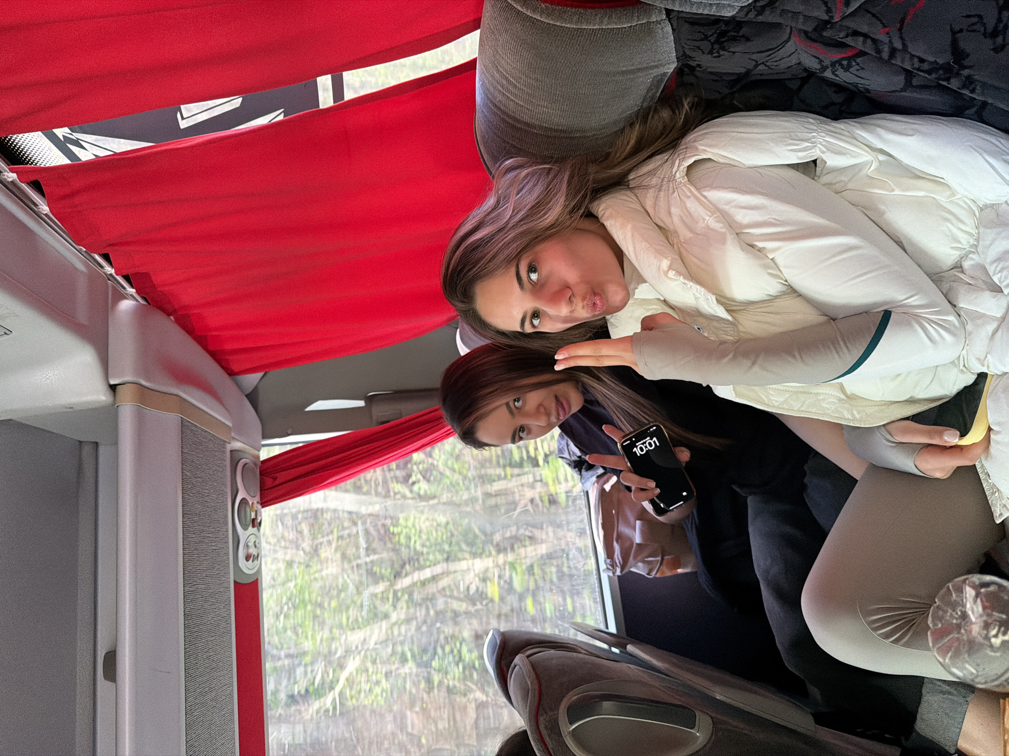Two young women are in a vehicle, possibly a bus, with red curtains