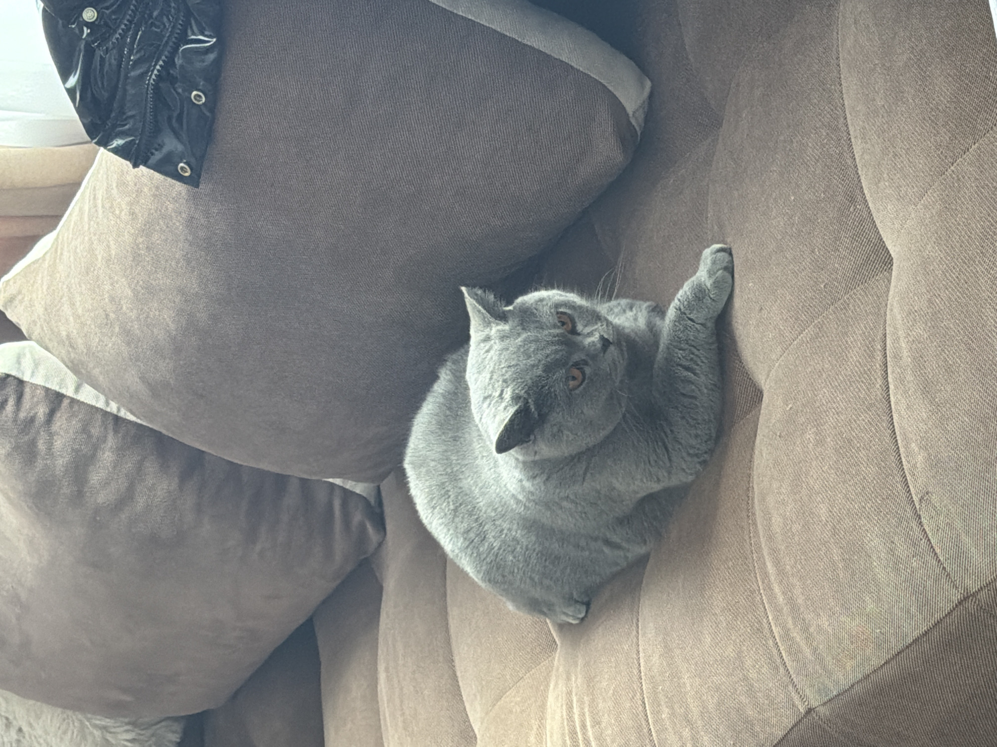 A gray cat lies on a brown couch. Part of a black jacket is visible on a pillow above the cat. The scene is interior and focuses on the cat and the surrounding furniture. The location in the city of Dragichevo, Bulgaria, is not discernible from the image.