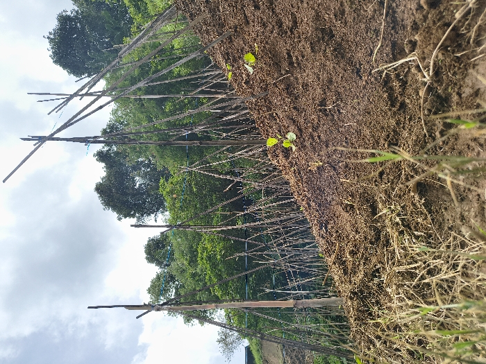 A hillside field displays young plants sprouting from rich, dark soil. Thin wooden poles form a dense, upright barrier or support structure, potentially for climbing plants. Lush green trees fill the background, extending upwards towards a cloudy sky. The angle of the shot presents an unconventional perspective of the agricultural landscape. Grass and other vegetation grow along the edges of the cultivated area.