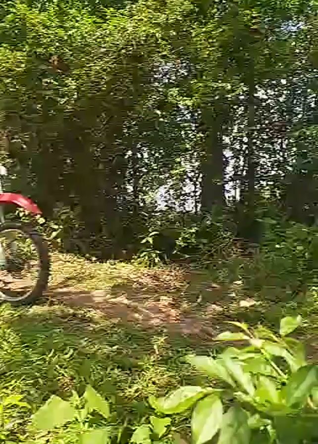 three people riding motorcycles on a narrow dirt path. The path is bordered by trees and lush green foliage. The camera perspective is rotated 90 degrees, with the sky visible in the upper left corner. The first rider is on a yellow motorcycle and wears black gear. The second rider has a red and white motorcycle, wearing a red and white helmet. The third rider is on a red and black motorcycle with a white number plate. They wear dark-colored gear. As the video progresses, each rider proceeds along the path.