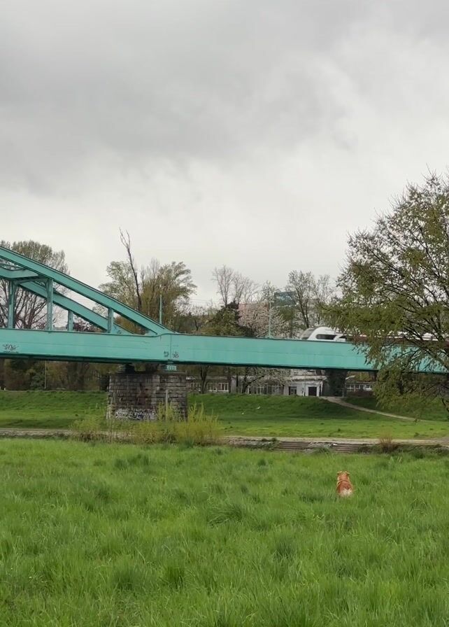 dog sitting in a grassy field in front of a green bridge. A train is moving across the bridge. The sky is cloudy. Some trees are on the left and right sides of the frame.