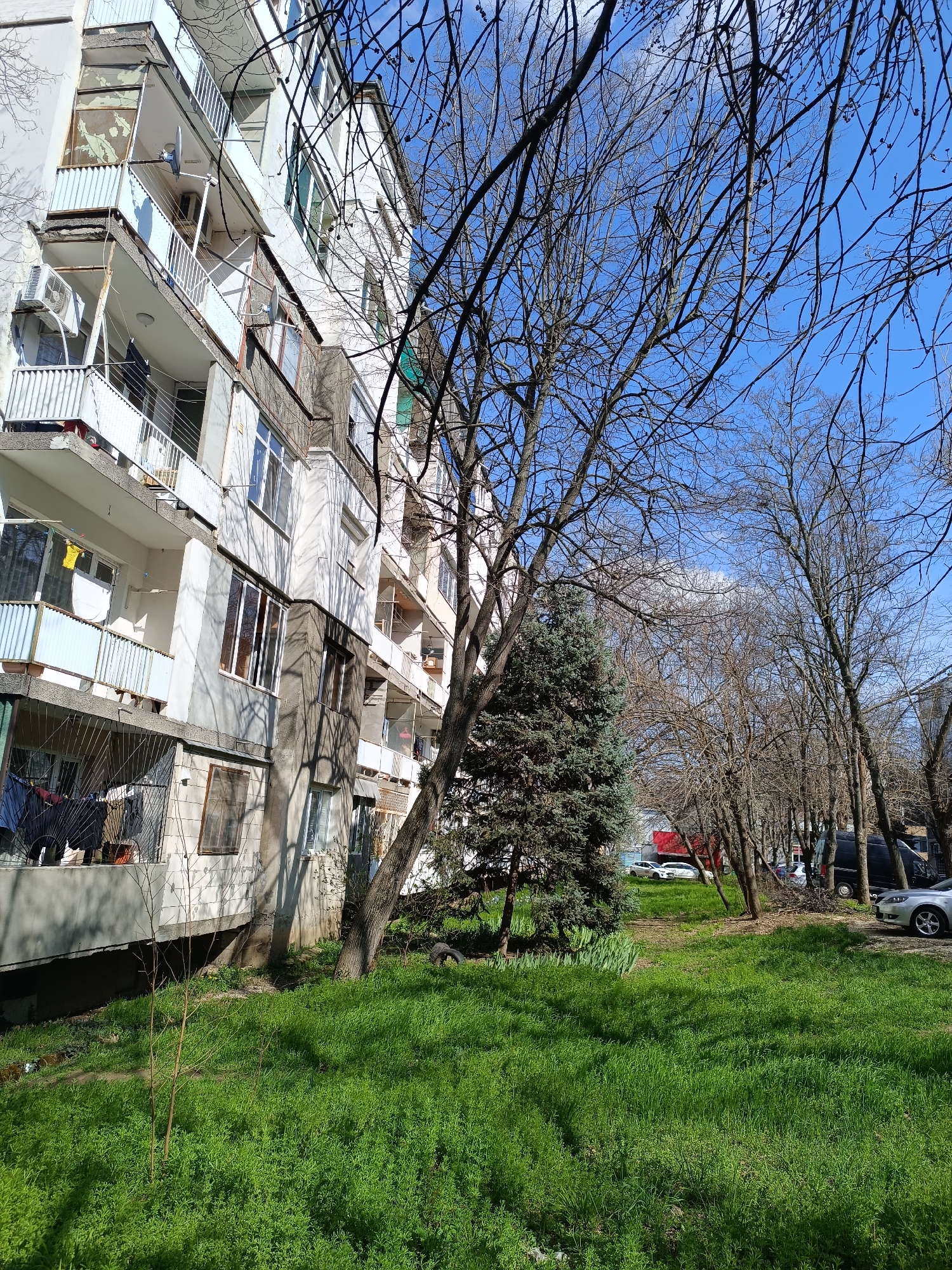 The image depicts an urban scene in Pleven, Bulgaria, featuring a multi-story residential building on the left side of the frame. The building is white with balconies and windows. Some balconies are enclosed with metal grates, and some appear to have laundry hanging. The foreground is dominated by a green lawn with tall grass. Several trees are present, some bare and others with green foliage. The trees create a sense of a tree-lined street or park area. In the background, a street with parked cars is visible. A red building is partially visible behind the trees. The sky is blue with some clouds. The overall scene captures a typical residential environment in Pleven.