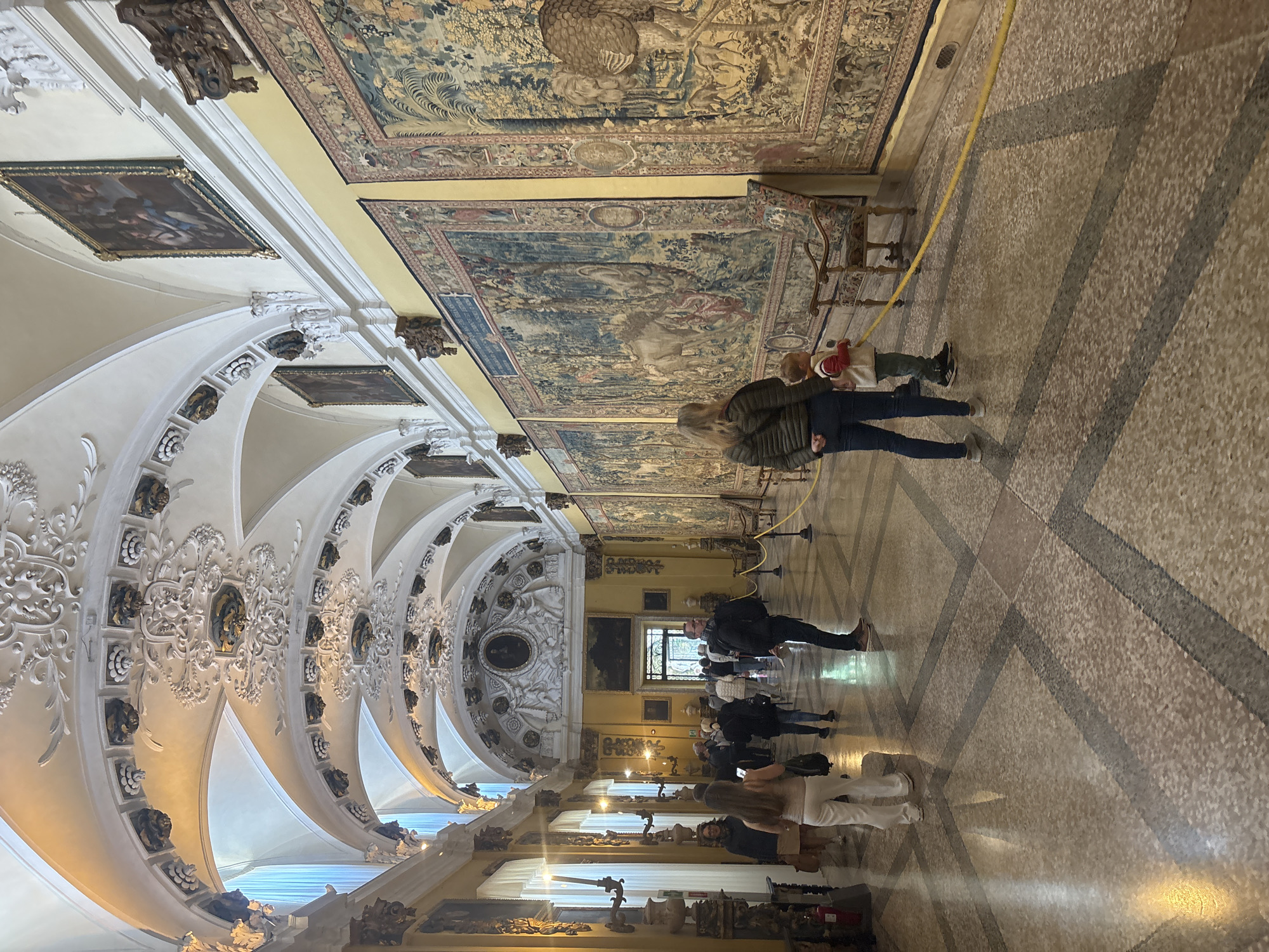 The image depicts the interior of a grand hall, likely a palace or museum, in Carciano, Italy. The hall features a vaulted ceiling with ornate plasterwork and paintings. Tapestries adorn the upper walls. Several people are present, including families and individuals, observing the tapestries and the architecture. The floor is patterned with geometric designs. A yellow rope is present, presumably acting as a barrier. Natural light enters the hall through windows at the far end. The environment suggests a historical or cultural landmark visited by tourists.