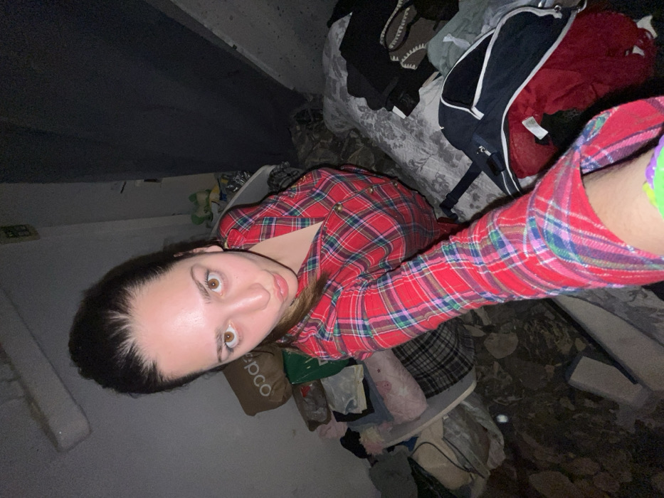 A young woman in a red plaid shirt takes a selfie indoors, looking up at the camera. The room appears cluttered, with bags and discarded items piled around her. She has dark hair pulled back, and her eyes are wide. There is a bag with "Pepco" branding near her. In the background, a bed or mattress is visible, covered with clothes and a backpack. The lighting is dim.