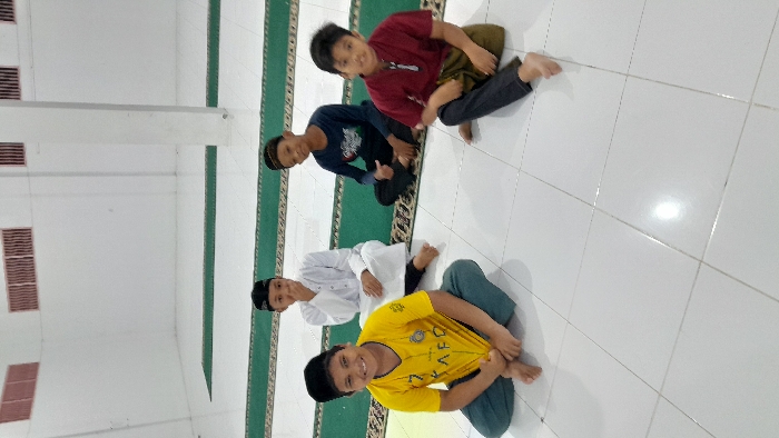The image displays four young males, estimated to be between 10 and 14 years of age, seated on a white tiled floor within a large, brightly illuminated indoor space. The environment suggests a prayer hall, likely a mosque or madrasah, characterized by two parallel green carpeted strips with gold-patterned borders running across the floor, indicative of prayer lines. The precise location within Lhokseumawe, Indonesia, is not identifiable from the visual information provided. From left to right: 1. A male subject, positioned in the foreground, wears a yellow short-sleeved t-shirt with "KAFD" printed on it, dark trousers, and a black songkok hat. He sits cross-legged, smiling directly at the viewer, with his hands clasped in front of him. 2. A second male subject, situated in the background behind the first, wears a white long-sleeved tunic, dark trousers, and a black songkok hat. He sits cross-legged, facing the viewer, with his right hand raised near his mouth and a subtle smirk. 3. A third male subject, located to the right of the second, wears a dark blue long-sleeved shirt with a light-colored graphic, dark trousers, and a black songkok hat. He sits cross-legged, facing the viewer, with his left thumb pointed upwards. 4. A fourth male subject, in the foreground on the right, wears a maroon short-sleeved polo shirt, an olive-green sarong worn over dark trousers, and no visible headwear. He sits with his legs bent, facing the viewer, displaying a slight smile. All four individuals are barefoot. The background consists of plain white walls and several reddish-brown rectangular ventilation grates or window frames with vertical slats positioned high on the wall. A single white support pillar is visible in the background, towards the right side of the frame. The glossy white floor tiles reflect overhead artificial lighting.