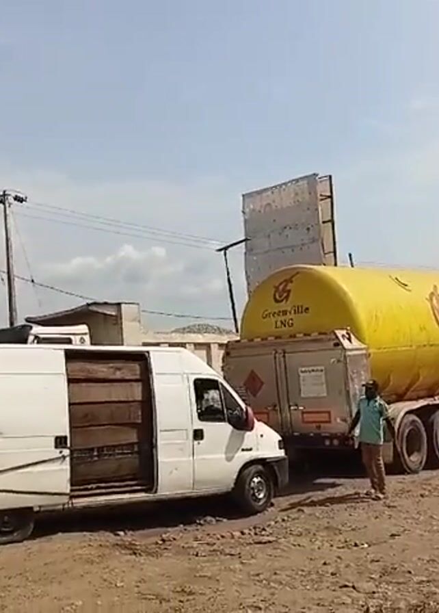 two yellow trucks, each with a trailer, parked on a dusty, uneven road. Both trucks are labeled "Greenville LNG". The first truck has a large cylindrical tank. The second truck has smaller tanks and the words "T489 Greenville LNG" on the cab. A white van with its side door open is parked between the two trucks. A man in a blue shirt is standing near the first truck, appearing to be inspecting it. There are power lines overhead and other vehicles and people in the background, suggesting this is a somewhat populated area. The sky is partly cloudy. The overall impression is of a commercial or industrial setting.