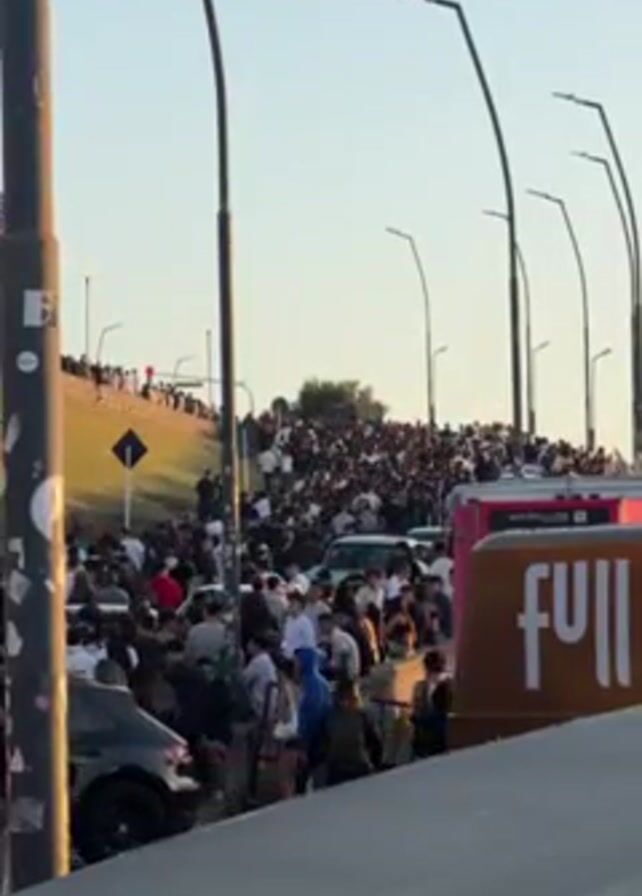 large crowd of people gathered along an elevated embankment or walkway on a sunny day. The crowd appears to be predominantly young adults, dressed in casual clothing. Cars and food trucks are visible among the crowd, suggesting a gathering or event. Street lamps line the area, and a sign with the word "full" is visible in the foreground. The camera angle is slightly below the crowd, looking upwards. There's a sense of congestion and activity in the scene.