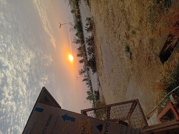 A landscape view shows a bright sunset partially obscured by low clouds. To the right, an arid, overgrown field slopes upward. Scattered vegetation lines the horizon where the sun is setting. In the foreground, construction materials, including a sheet with the words "UNITY BOND Composite" and an arrow, are stacked near a metal grate. A small, red triangular object sits beside the grate.