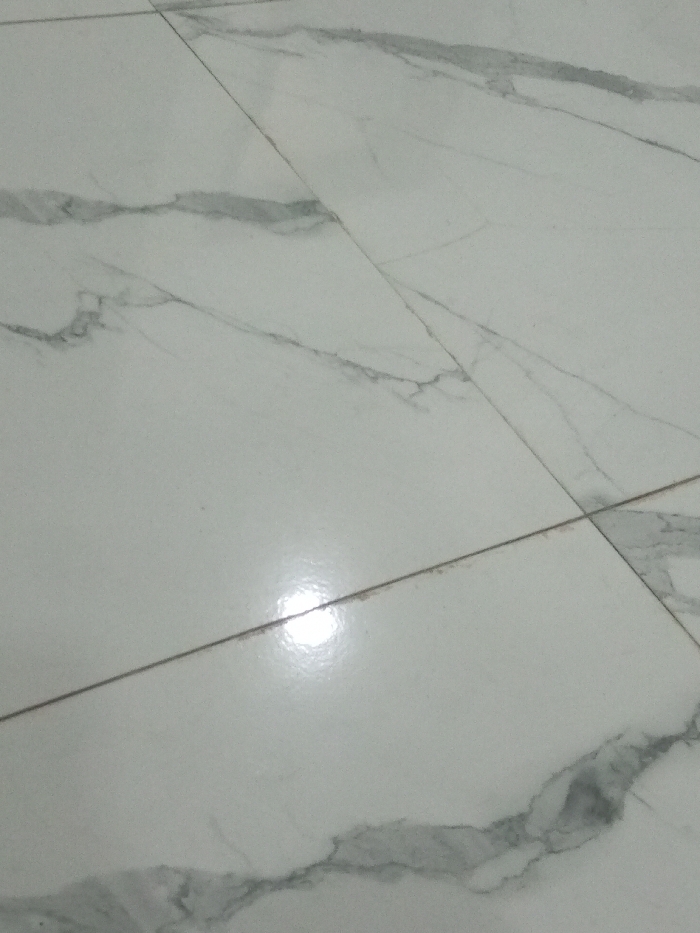 close-up view of a light gray tile floor with dark gray veining patterns resembling marble