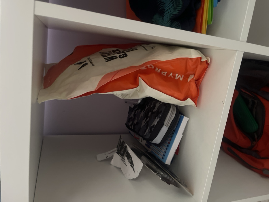 An open, white shelf contains a mix of items. A partially collapsed orange and white bag labeled "MYPROTEIN" rests on top. Below, a gray and black camouflage patterned pencil case sits on a stack of notebooks with white and blue covers. A few loose sheets of paper, some torn, lie near the front edge. A red and black bag with a green item inside can be partially seen to the right.