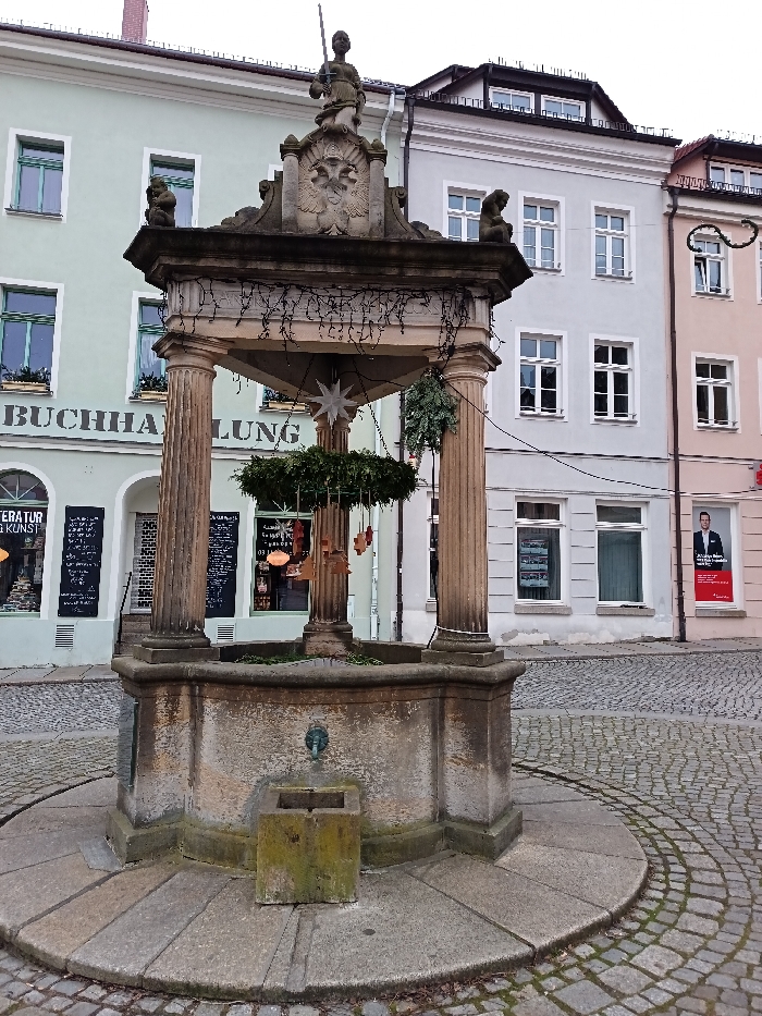 The image displays the Justitia Fountain situated in the market square of Kamenz - Kamjenc, Germany, under an overcast sky. The fountain, constructed from weathered grey stone, occupies the center of a cobblestone square, set upon a circular stone base. Its lower section features an octagonal basin with a brass-colored spigot and a small, rectangular stone trough, which exhibits moss growth. Four fluted stone columns rise from the basin, supporting a square canopy. The canopy's top is elaborately carved, displaying a double-headed eagle crest and a standing female figure holding a sword, identified as Justitia. Additional smaller sculpted figures are positioned at the canopy's corners. The fountain is decorated with seasonal elements: an unlit string of bare light bulbs drapes along the canopy's perimeter, a large green evergreen garland hangs suspended beneath the canopy, and a white star ornament is centrally positioned, with several smaller wooden ornaments dangling from the garland. In the background, a row of multi-story buildings lines the square. To the immediate left, a light green building with green-framed windows features a ground-floor establishment identified by a "BUCHHANDLUNG" (bookstore) sign. Its arched storefront windows display literature and art, flanked by blackboards with written text. Adjacent to this, a light grey building presents white-framed windows, including attic dormers. Further to the right, a light pink building contains ground-floor windows, one of which displays what appear to be real estate listings, and another features a large red banner advertisement depicting a man in a suit. No individuals are visible within the frame.