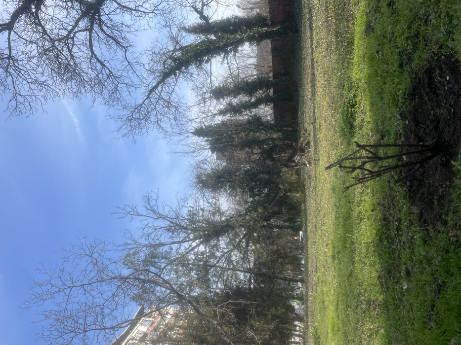 The image displays an outdoor scene in Stara Zagora, Bulgaria, under a clear, bright blue sky with a faint wispy cloud in the upper right. The foreground features a small, leafless, multi-stemmed woody plant, approximately 0.5 meters tall, emerging from dark soil, positioned centrally at the bottom of the frame. The ground consists of short green grass intermingled with patches of brown soil and sparse organic debris, illuminated by direct sunlight creating dappled shadows. In the midground, an expansive grassy area stretches towards a dense line of trees. This tree line includes both deciduous trees, devoid of leaves, and several coniferous evergreen trees. To the right-center midground, a pile of cut branches and wood debris lies on the grass. The background on the left reveals a portion of a light-colored, multi-story building with visible balconies, partially obscured by the trees. On the right, a reddish-brown brick wall, partially covered by green ivy, runs horizontally behind the tree line. No people or animals are present in the scene. The overall environment suggests an open green space, possibly a park or undeveloped lot, during late winter or early spring.