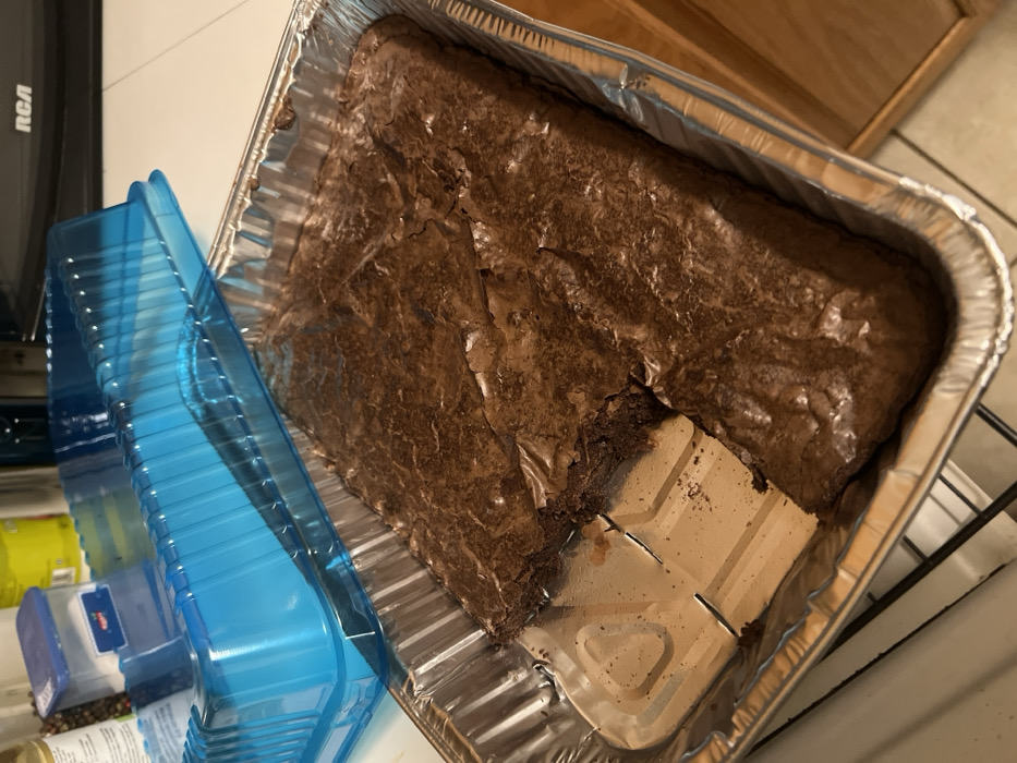 - "A tray of chocolate brownies sits in a foil container next to a blue plastic lid" by FM-tsGmC2, licensed under CC BY 4.0