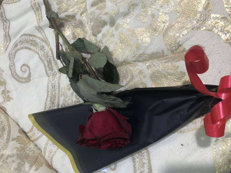 - "A single dark red rose, exhibiting signs of wilting, rests diagonally on a textured white and gold patterned fabric surface" by FM-E3A3g1, licensed under CC BY 4.0