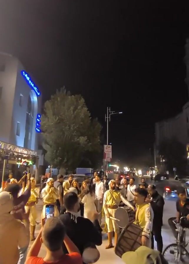 At night, a group of people are gathered on a street. Most are dressed in yellow robes, and some are playing drums. A bride and groom are in the center, and several people are recording with their phones. There is a building with lights and a tree next to it. There are some cars in the background and streetlights. The sky is dark.