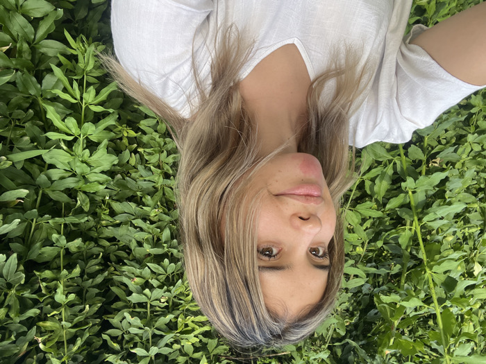 A person lies in a field of green foliage, their head positioned toward the bottom of the frame. They are wearing a white shirt, and their blonde hair frames their face. The foliage covers the ground, creating a natural backdrop. The person's gaze is directed upwards.