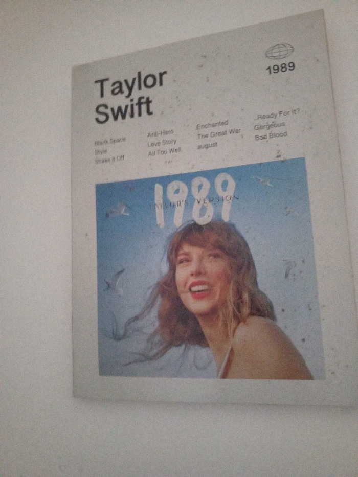 A rectangular poster, affixed to a plain, light-colored wall, is depicted from an oblique, low-angle perspective in an unspecified location within Unknown, Indonesia. The poster features a white top section with black text and a lower section displaying a photographic image. The top section reads "Taylor Swift" in large sans-serif font, with the number "1989" positioned in the upper right. Below "Taylor Swift," a tracklist is arranged in three columns: - Column 1: "Blank Space," "Style," "Shake It Off" - Column 2: "Anti-Hero," "Love Story," "All Too Well." - Column 3: "Enchanted," "The Great War," "august," "Ready For It?," "Gorgeous," "Bad Blood" The lower, larger section of the poster displays a color photograph of a smiling Caucasian female, identified as Taylor Swift, shown from the chest up. She has shoulder-length, wavy light brown hair with bangs and is looking slightly upwards with an open-mouthed smile, revealing teeth. She is wearing a light-colored, possibly off-shoulder or strapless garment. The background of the photograph is a pale blue sky with multiple white birds, likely gulls, in flight. Overlaid on this image are large white numbers "1989" and smaller white text "TAYLOR'S VERSION" below. The wall is a uniform light color, possibly white or off-white, exhibiting minimal texture. The poster itself shows minor dark specks and a slightly grainy texture across its surface. The scene is evenly lit by diffuse ambient light, casting no distinct shadows.