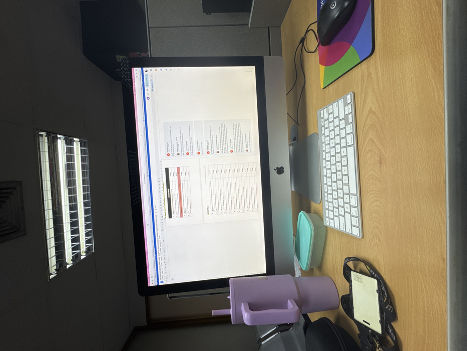 The image displays an unoccupied office workstation located in an indoor office environment in Caracas, Venezuela. A light wood-grain laminate desk occupies the foreground. Centrally positioned on the desk is a silver Apple iMac computer with a black screen bezel, currently displaying a web browser. The browser shows a document, likely a spreadsheet or project management interface, with columns of data and a side panel containing comments or tasks, predominantly in Spanish. To the left of the iMac, a large, light purple insulated tumbler with a handle and straw is present. Adjacent to the tumbler and in front of the monitor, a small, rectangular, translucent teal plastic container with a clear lid rests on the desk. Further left, an obscured white identification badge is visible, attached to a black lanyard with partially visible white text, possibly "BORN". A black soft case or bag is partially visible behind the tumbler and badge. To the right of the iMac, a white Apple Magic Keyboard is placed directly in front of the monitor's stand. To the right of the keyboard, a black Logitech gaming mouse is positioned on a multi-colored mousepad featuring geometric shapes in red, orange, yellow, green, blue, and purple segments. The background shows dark gray office partitions or cubicle walls to the right, and a lighter wall or partition to the left. Overhead, a rectangular fluorescent light fixture with a reflective grate and a ventilation grille are visible in the ceiling.