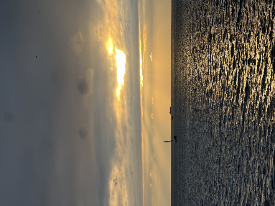 The image depicts a seascape observed from Kadıköy, Turkey, likely facing the Marmara Sea during sunset or sunrise. The sky occupies the upper two-thirds of the frame, characterized by dark gray, overcast clouds. A prominent horizontal band of intense golden-yellow light emanates from a clear break in the lower cloud layer, illuminating the horizon and reflecting on the water. Several small, dark avian forms are discernible in the upper sky. The lower third of the frame comprises dark blue-gray water with visible ripples. A shimmering path of golden light, a reflection of the sky, extends across the water surface from the horizon towards the bottom right. Three vessels are present on the water: a dark-silhouetted sailboat with a single mast and sail is positioned in the mid-left, carrying indistinct figures on its deck; a large, dark cargo or tanker ship is visible further in the mid-right, closer to the horizon; and a smaller, indistinct dark vessel is located between the sailboat and the larger ship. All vessels appear to be in transit.