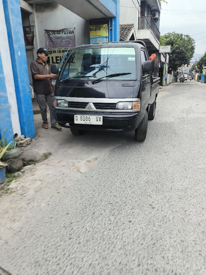 A black Mitsubishi pickup truck (license plate D 8086 VX, expiration 04-28) is parked on a textured asphalt road in Cimenyan, Indonesia. A man, wearing a brown t-shirt, dark pants, and a black baseball cap, stands to the left of the truck's driver's side, appearing to adjust or interact with the side mirror. He wears open-toed sandals. The truck is positioned near a building with a blue and white striped column on the left. Faint Indonesian text is visible on a sign behind the truck, partially reading "CV DZ PUTRA" and mentioning "Bandung." Below this, a yellow sign with "board" is partially visible. The building to the right of the truck has multiple stories and balconies. Potted plants, some in recycled containers, are on the ground near the blue column. The road extends into the background, revealing a residential or commercial street lined with various buildings and trees. Distant motorcycles and other vehicles are visible further down the street. The sky is overcast.