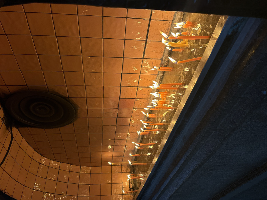 The image displays a dimly lit interior or sheltered area in Beyoğlu, Turkey. A long, dark, rectangular basin or trough occupies the mid-ground, containing numerous burning taper candles. Approximately 40-50 candles, predominantly orange with some yellow, are standing upright in a reflective liquid, likely water mixed with melted wax, which reflects their flames. The background consists of a wall and an arched ceiling covered uniformly with square, glossy orange-brown ceramic tiles. A dark, circular vent or fan structure is recessed into the tiled archway in the upper left section of the image. The immediate foreground features a dark, textured, sloping surface. No individuals are present in the scene. The primary light source is the collective illumination from the candle flames.